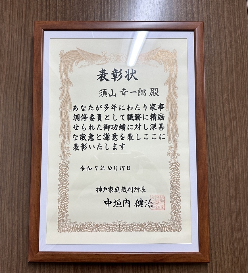 このたび、神戸家庭裁判所より家事調停委員の長年勤続に対する表彰を受けました。